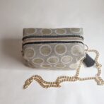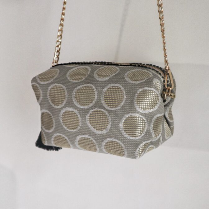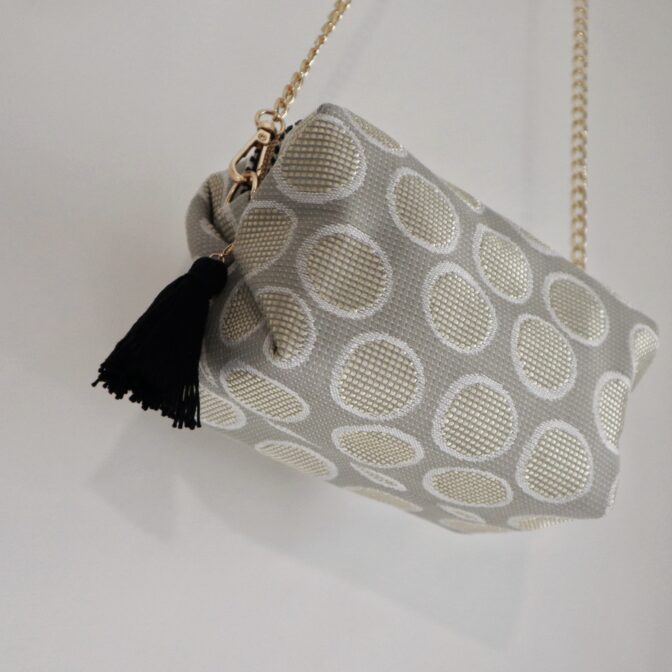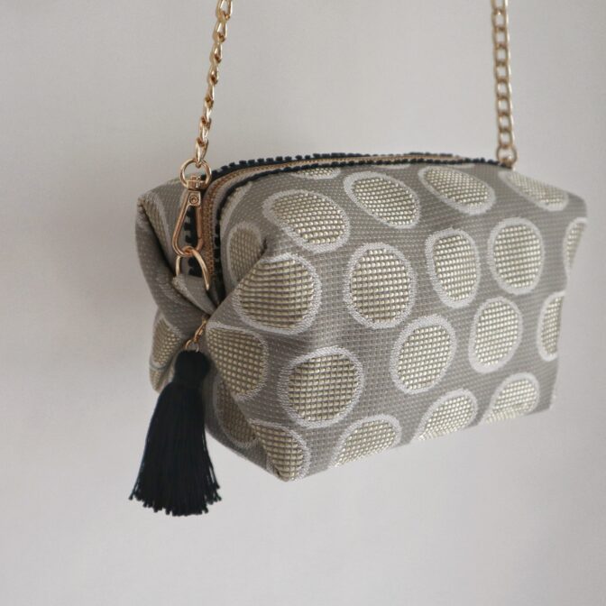 こちらのドットのゴブラン織りの生地は、インテリアショップでソファーの張り地として売られていたものなんですが、ランダムなドットが素敵でキャラメルポーチに仕立ててみました。