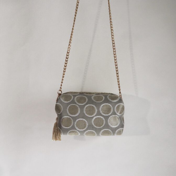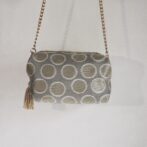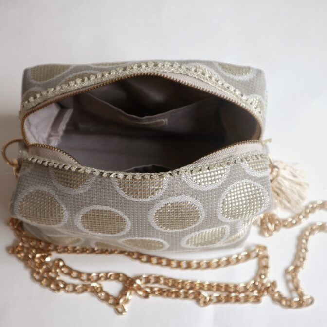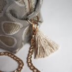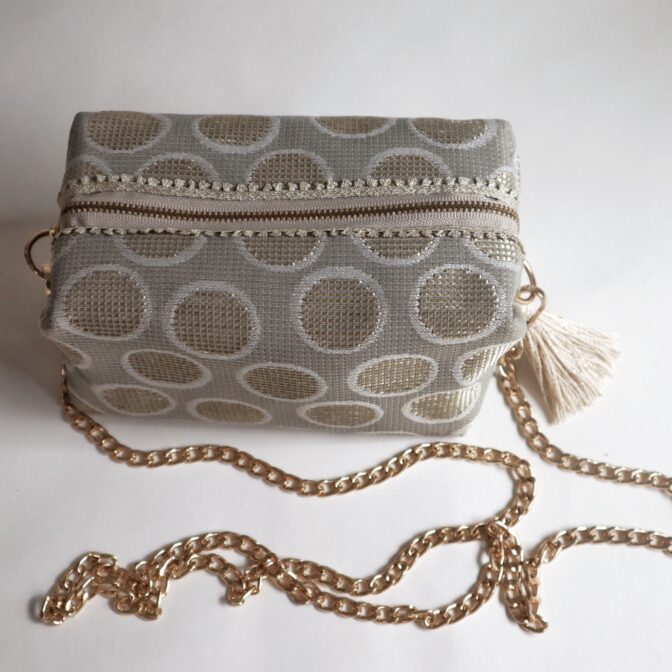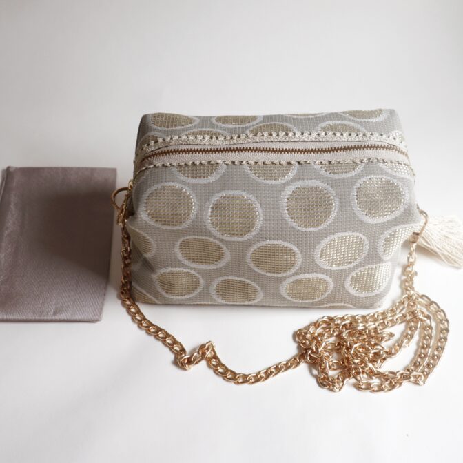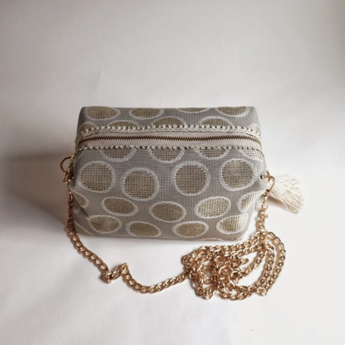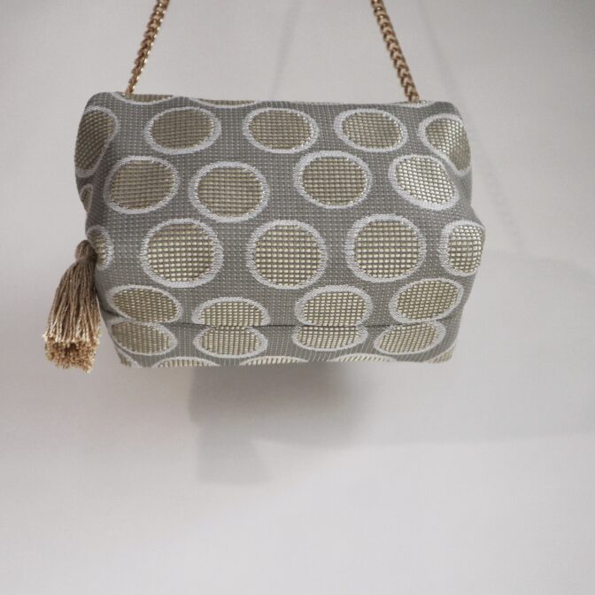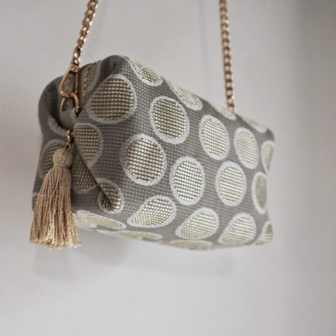 こちらのドットのゴブラン織りの生地は、インテリアショップでソファーの張り地として売られていたものなんですが、ランダムなドットが素敵でキャラメルポーチに仕立ててみました。 小さいながらもボリュームのあるフリンジをアクセントとして付けています。 ファスナー部分には上品なシャンパンゴールドのレースをあしらいました。 チェーンが品のあるゴールドですので、コーデの差し色や、アクセとあわせたりしても素敵です。 スマホやお財布も入りますので、斜めがけにして