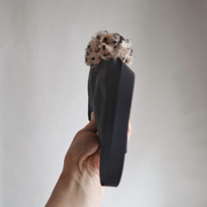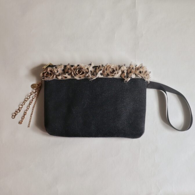 グログランリボンの持ち手付き 黒の帆布にドットのバラのレースをぐるりと付けました。