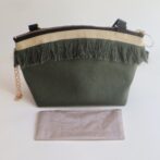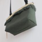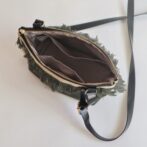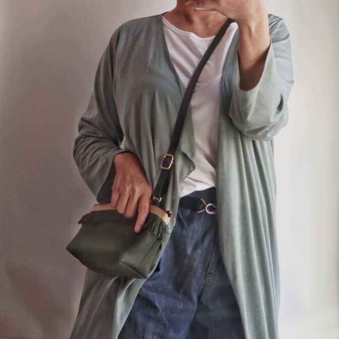 なめらかにカーブを描いた袋口と、そこにベージュのグラグランリボンを縫い付けて、カジュアルな中にも柔らかいニュアンスのあるショルダーポーチが出来上がりました。