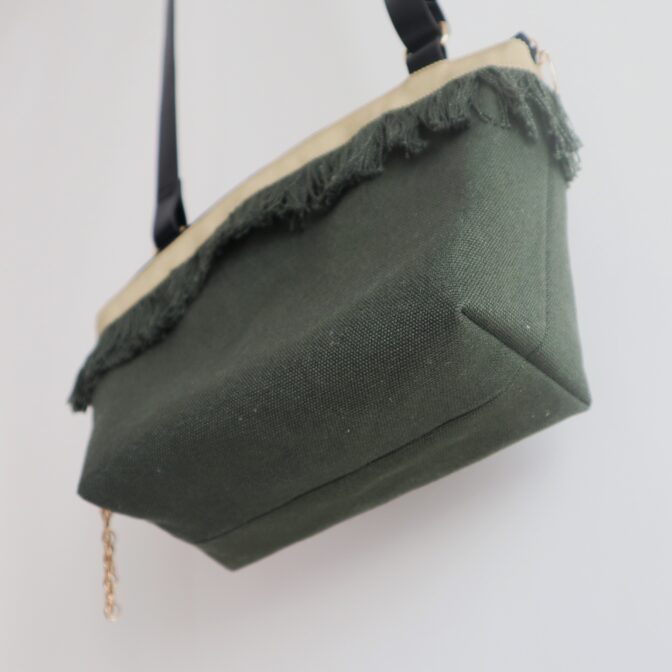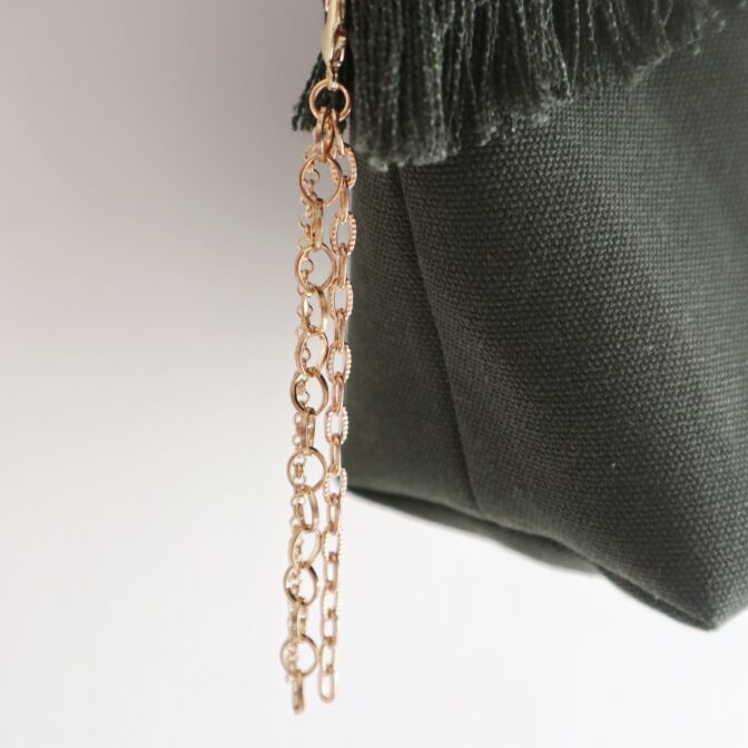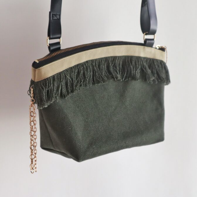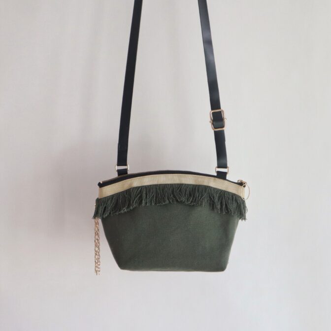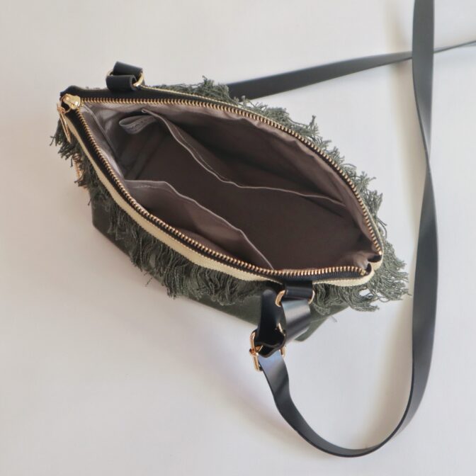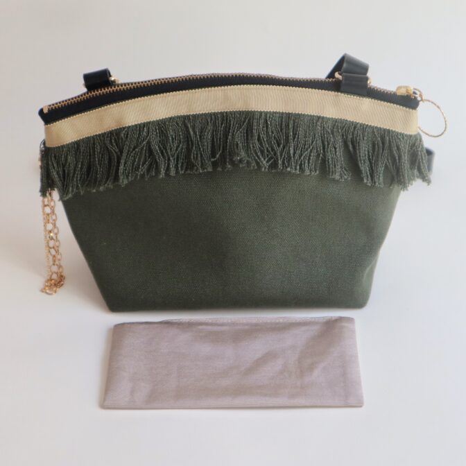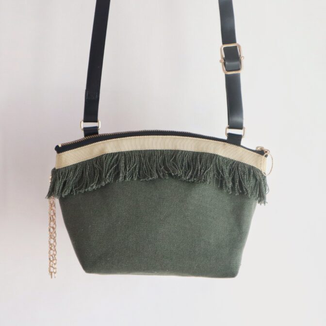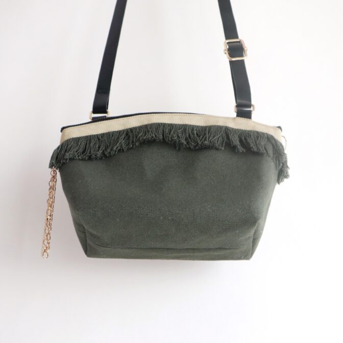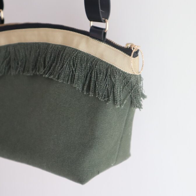 本体が帆布、その帆布を丁寧にほどいて作ったフリンジがポイントのカジュアルなショルダーポーチです。